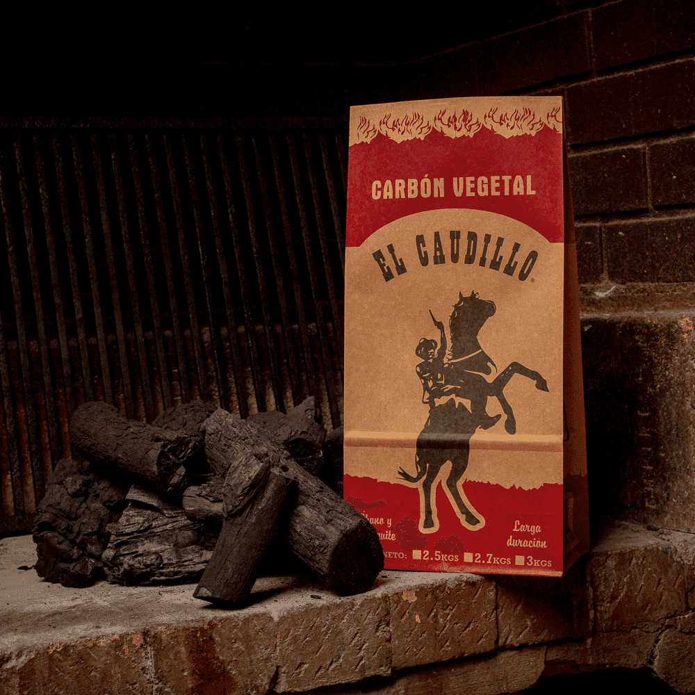 Solenvasa ofrece el diseño El Caudillo en dos versiones. La bolsa para carbón El Caudillo 3kg usa una medida de 22+12x45cm y es compatible con pesos de 2.5kg a 3kg. La versión de 2.7kg usa una bolsa mas corta de 22+12x40cm, ideal para presentaciones de menor peso y precio de venta mas accesible. Ambas versiones comparten el mismo diseño impactante a 2 tintas y la misma calidad de papel kraft.