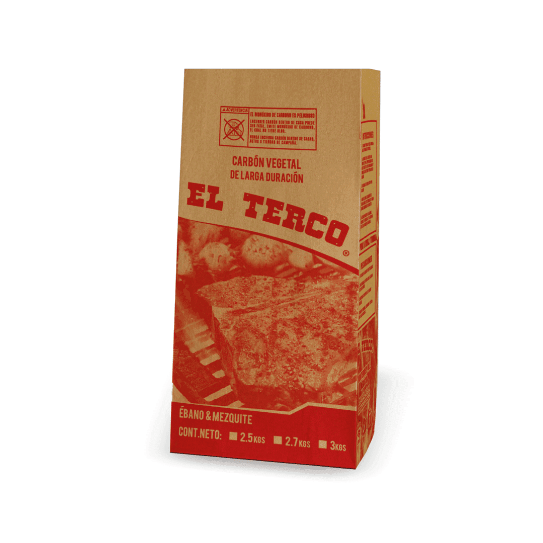 Cada paquete incluye 250 bolsas de papel kraft capa sencilla con impresión del diseño El Terco a 1 tinta. La medida de la bolsa es 22+12x45cm, compatible con presentaciones de 2.5kg, 2.7kg y 3kg de carbón vegetal. Disponible en 2 colores: rojo y negro. El frente esta impreso en español y el reverso en ingles, facilitando su comercialización en México y en exportaciones al mercado hispano de Estados Unidos.