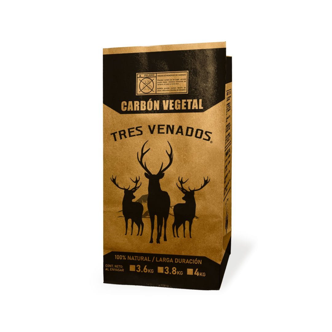 Cada paquete incluye 100 bolsas de papel kraft doble capa con impresión del diseño Tres Venados a 1 tinta en negro. La medida de la bolsa es 28+15.5x49cm, compatible con presentaciones de 3.6kg, 3.8kg y 4kg de carbón vegetal. El frente esta impreso en español y el reverso en ingles, facilitando su comercialización en Mexico y exportaciones a Estados Unidos donde las presentaciones de 8lb y 8.8lb son muy demandadas.